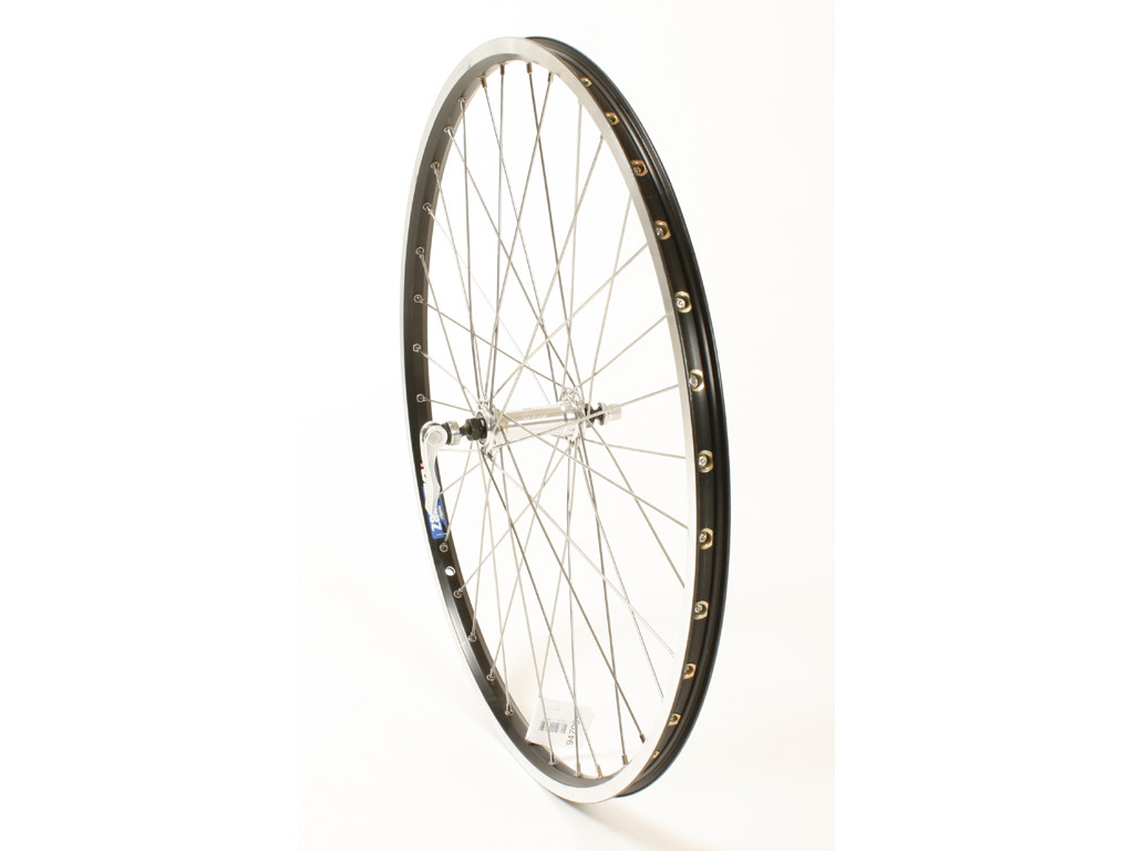 Forhjul med sort fælg i aluminium 24mm bred målt udvendig og nav i blank aluminium og med 36 stk. rustfri stå…